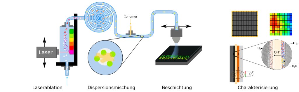 In order for AEM technology to develop its full potential, high-performance and cost-effective catalysts are required. Up to now, screening methods have been time-consuming and only capture individual compositions. In the HOLMES-AEM project, we are therefore pursuing an innovative approach: laser-based synthesis produces catalysts from high-entropy alloys. Using targets with many different sectors, the composition of the nanoparticles is to be specifically varied during the ongoing ablation process.