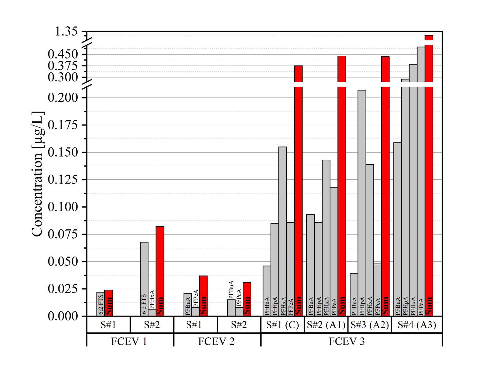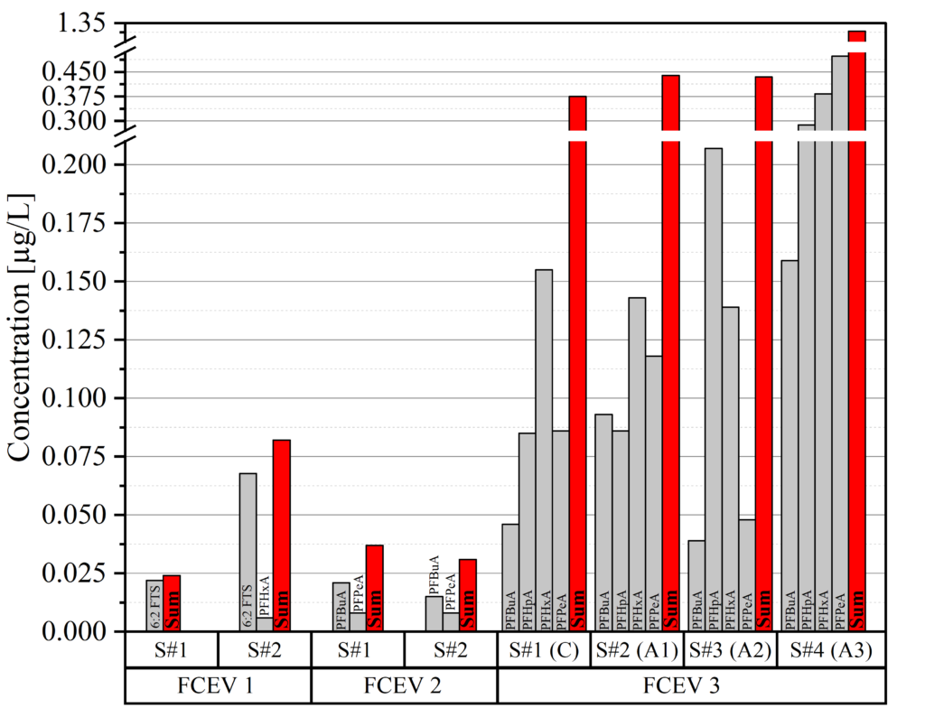 Die Abbildung zeigt den Nachweis von PFAS im Produktwasser von drei Brennstoffzellenfahrzeugen (FCEV 1–3): Dargestellt sind die gemessenen Konzentrationen verschiedener PFAS; die roten Balken zeigen die jeweilige Gesamtmenge aller nachgewiesenen PFAS. Zur besseren Übersicht sind nur Werte über 0,005 µg/L dargestellt. S steht für Probe, C für Kathode und A für Anode. Nach Lange et al., 2025.